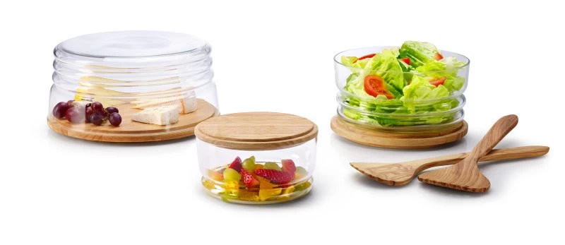 Formschöne flache Käseglocke aus mundgeblasenem Glas, optimal zur Präsentation von Käse. Die Glocke dient herumgedreht als Salatschüssel, der Holzteller als Deckel. Platzsparend stapelbar. Gewinner German Design Award Special 2017.