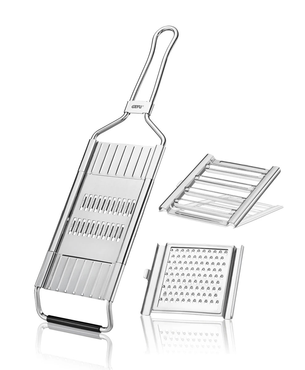 • mit 3 Wechseleinsätzen: 4 Doppelklingen-Einsatz, 2-Wege-Julienne-Einsatz und Feinreibe-Einsatz