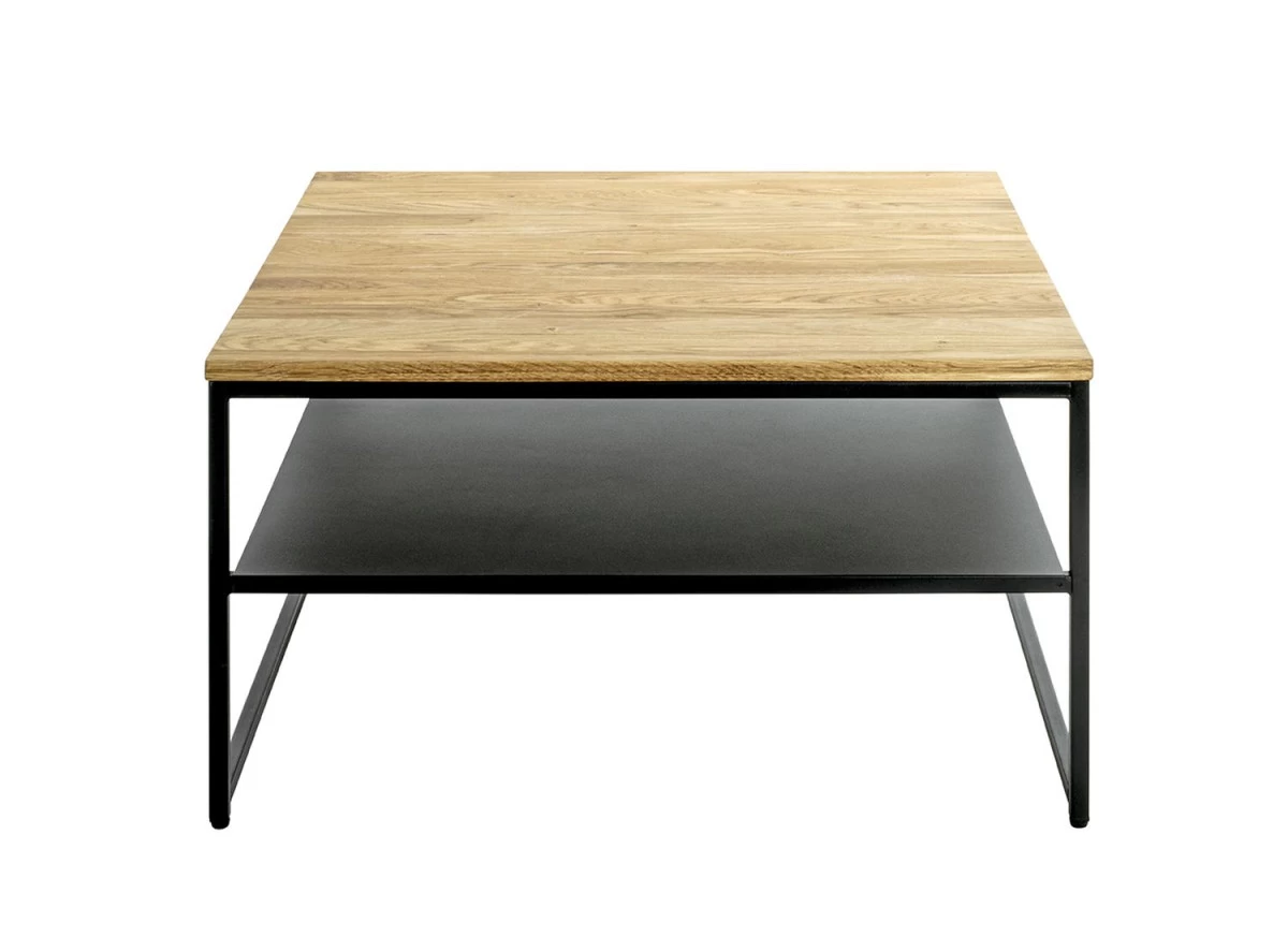 aus Stahlrohr in schwarz lackiert, Ablage aus Massivholz Eiche geölt und untere Ablage aus Metall schwarz lackiert