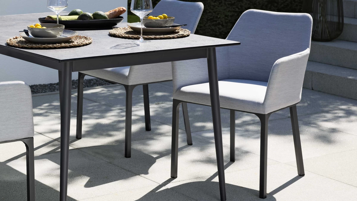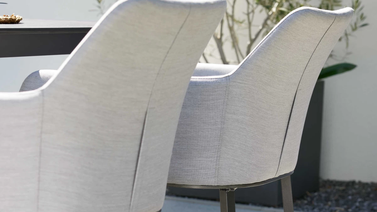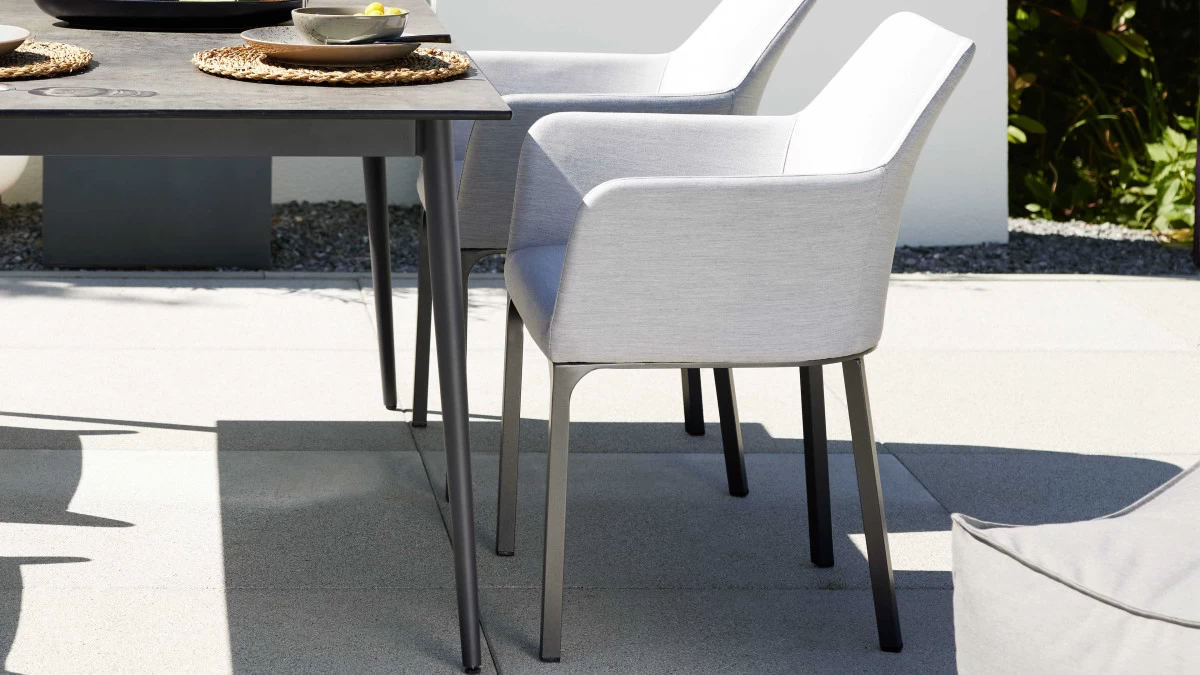 Details hellgrauer Solution Dyed Acrylbezug anthrazitfarben pulverbeschichtetes Aluminiumgestell Sitz und Rücken mit hochwertiger PU-Schaumpolsterung mit Imprägnierung ausgerüstet Solution Dyed spinndüsengefärbtes Garn während der Faserproduktion werden Farbpigmente zugefügt und damit unauslösbar in die Faser eingebracht lichtecht UV-beständig vor Alterungsvergilbung geschützt schmutz- und wasserabweisend Maße ca. 62 x 81 x 62 cm (BxHxT) Sitzhöhe ca. 46 cm Highlights der Serie passender Tisch in zwei Größen und vier Farben erhältlich 5 Jahre Herstellergarantie