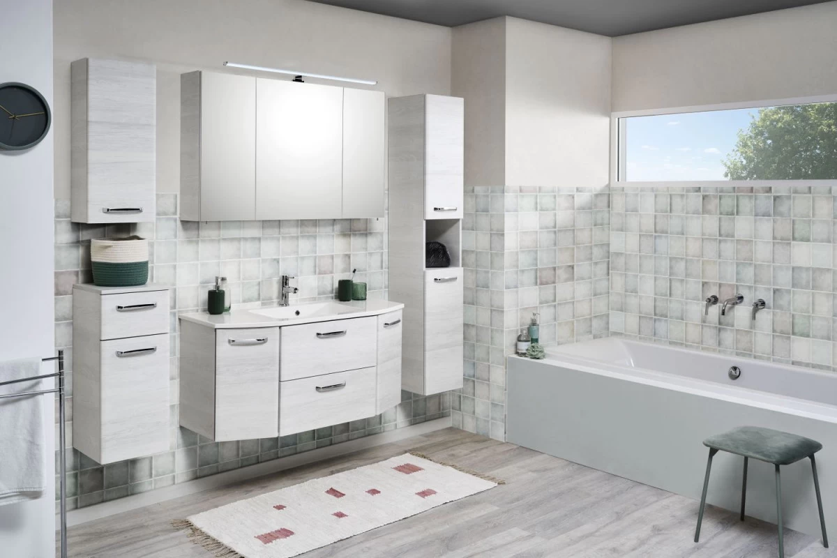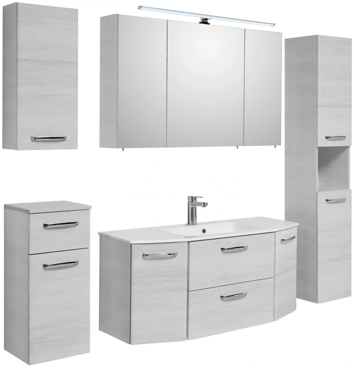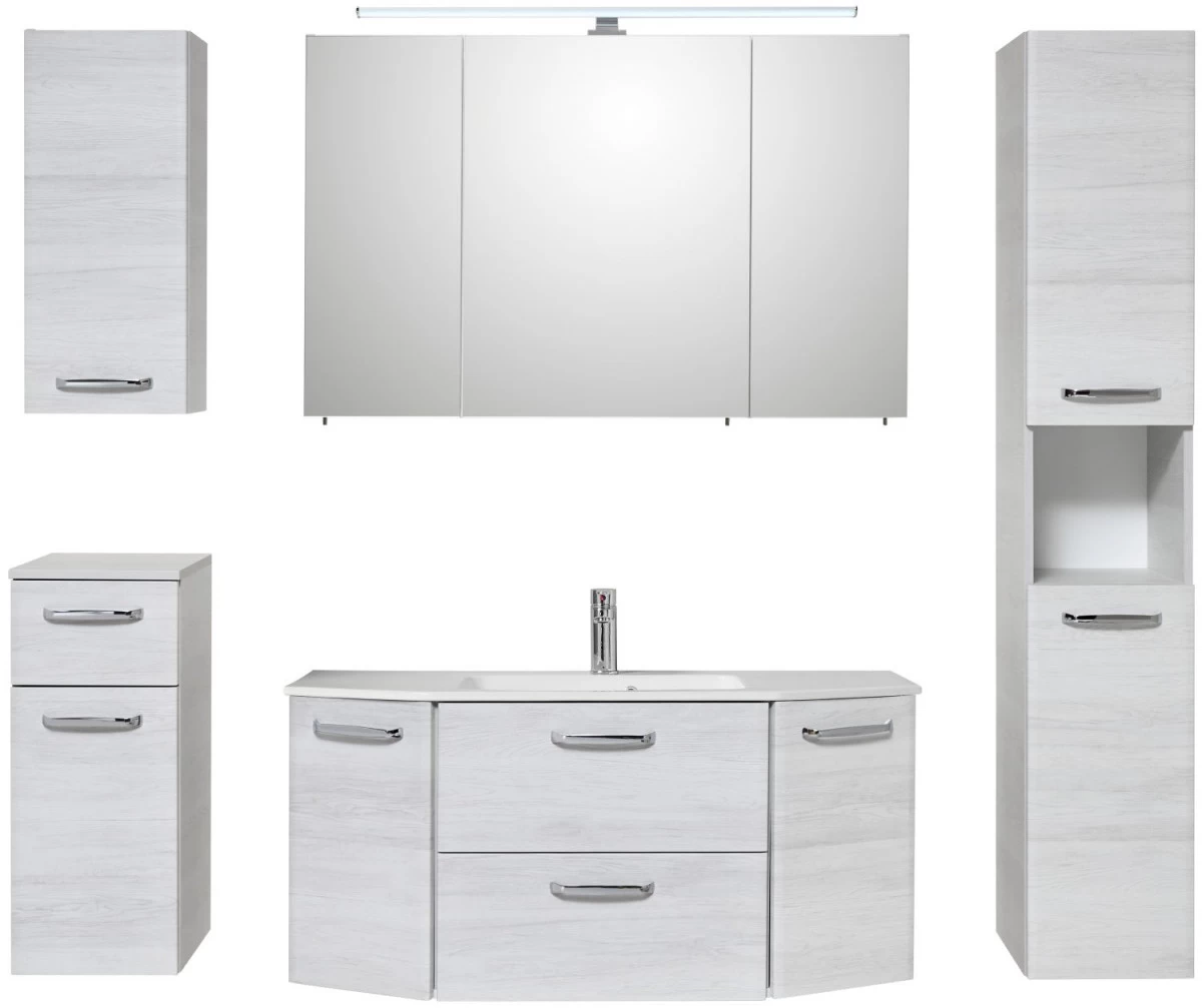 Quickset 936 Block bestehend aus: Keramikwaschtisch 980.991120, Waschtischunterschrank 936.011118, Spiegelschrank 45.491186, Hochschrank 936.013028, Unterschrank 936.013040 & Wandschrank 936.013030, Eiche Weiß quer NB, Türdämpfung, wandhängend