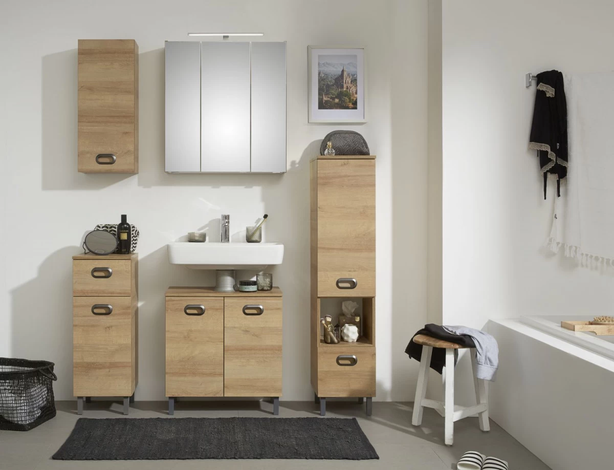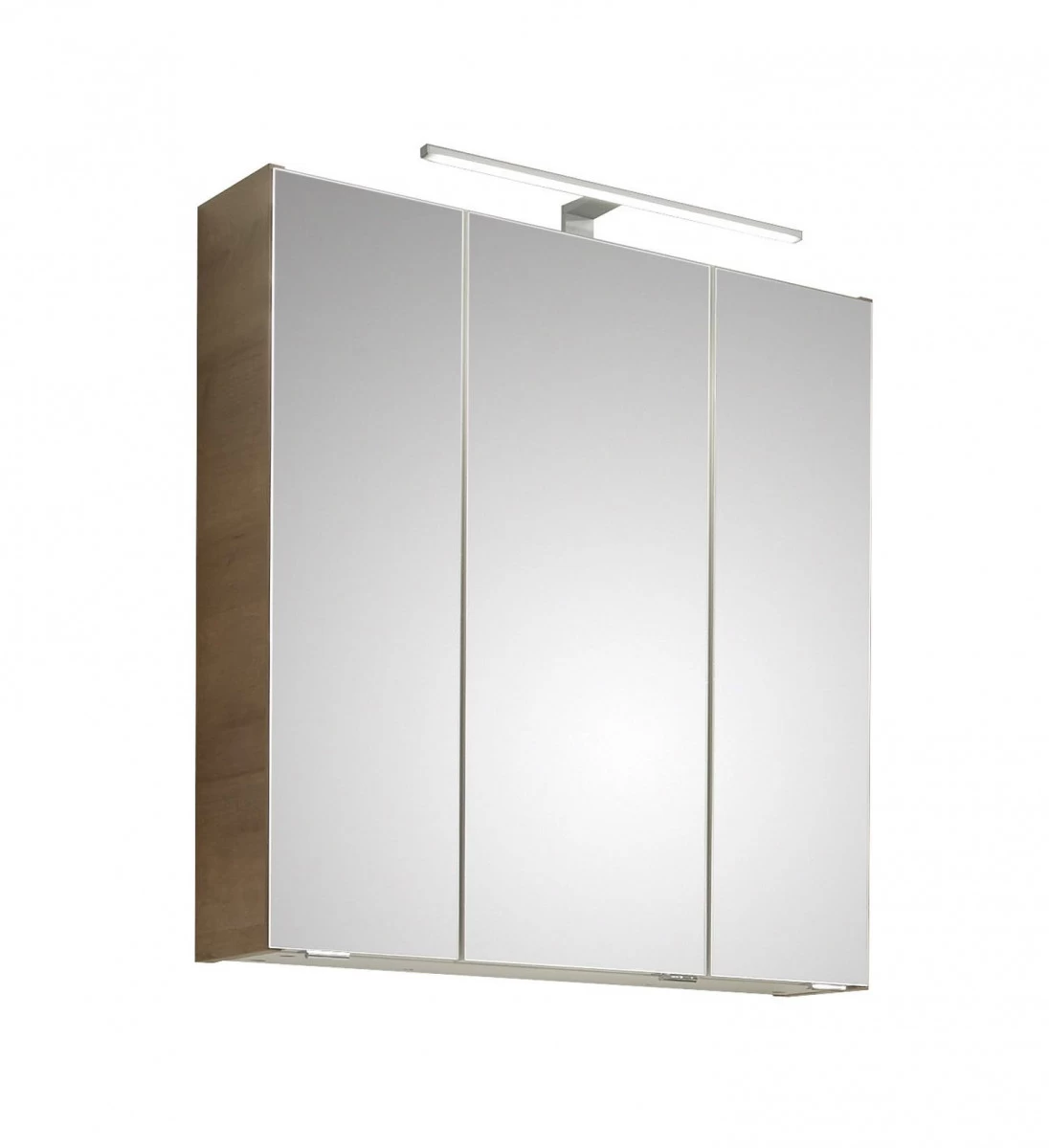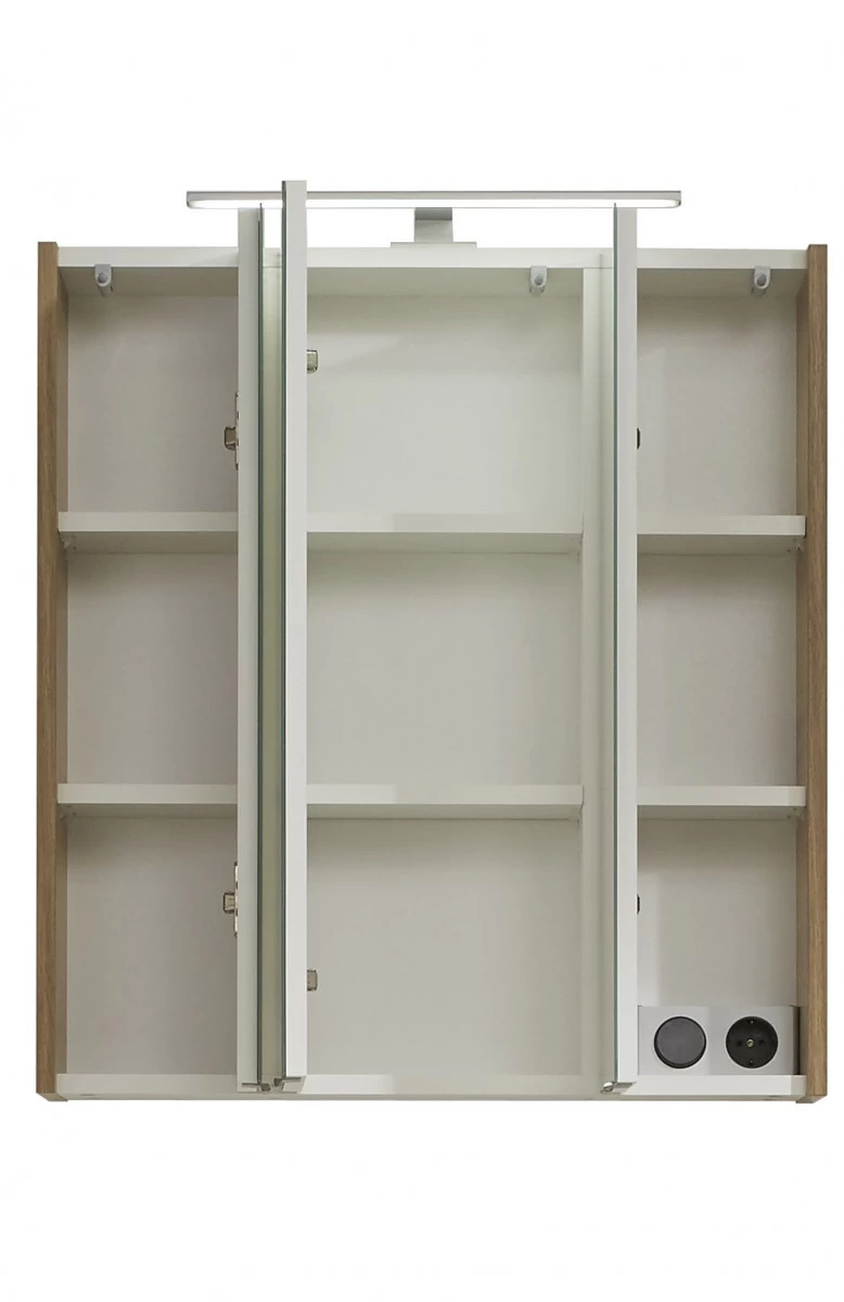 Quickset 353 Spiegelschrank 31-I, Riviera Eiche quer NB, inkl. Aufsatzleuchte, 3 Spiegeltüren, 6 Einlegeböden, Schalter/Steckdose