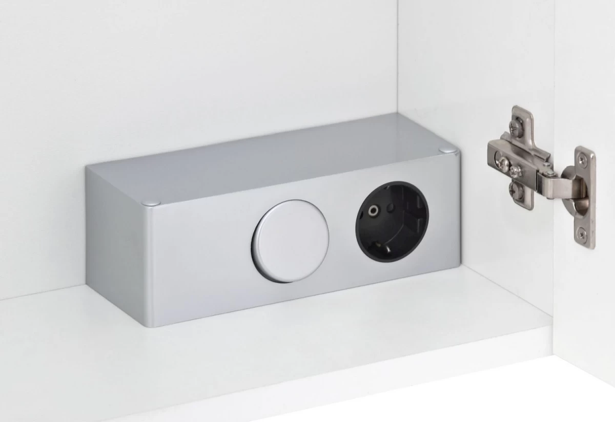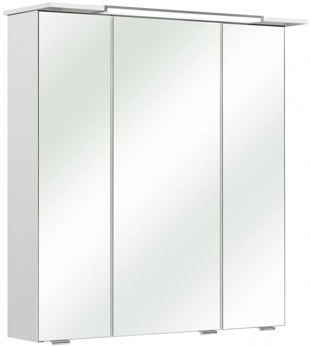Quickset 376 Spiegelschrank 54-I, Weiß Glanz, Kranzboden mit LED-Leuchte, 3 Spiegeltüren, 6 Einlegeböden, Schalter/Steckdose, Türdämpfer