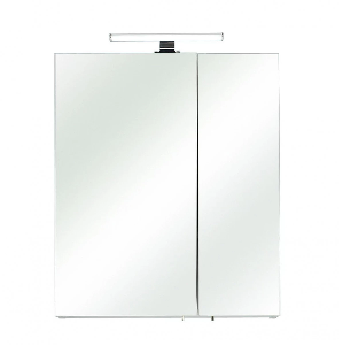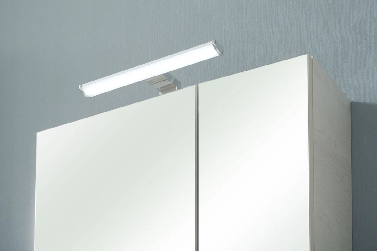 Quickset 936 Spiegelschrank 86, Eiche Weiß quer NB, inkl. LED-Aufsatzleuchte, 2 Spiegeltüren, 2 Einlegeböden, Schalter/Steckdose, Türdämpfung