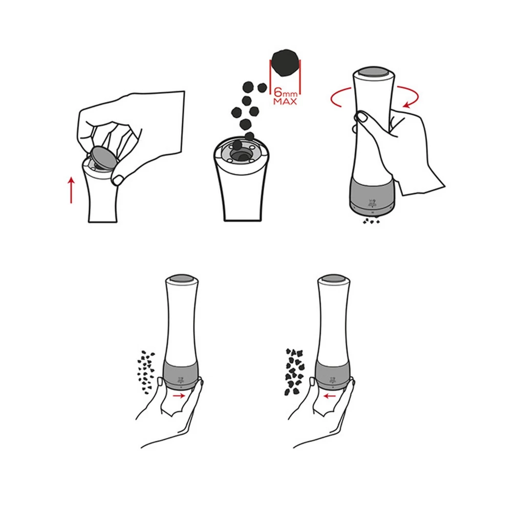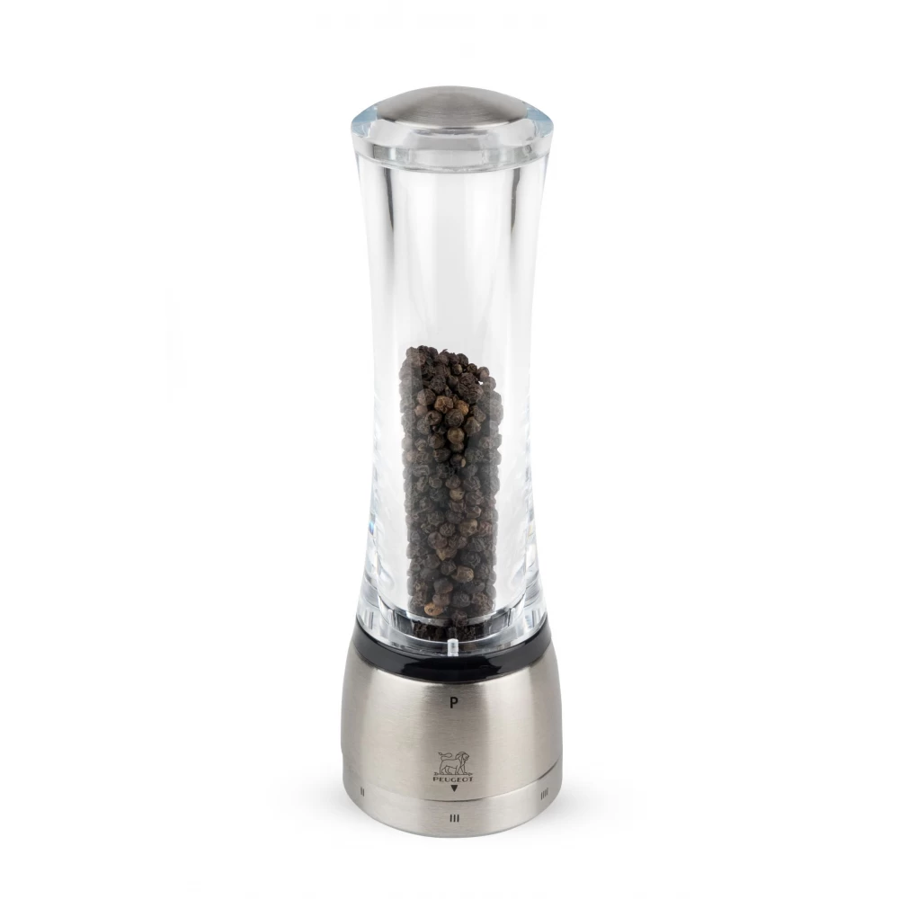 Die 21 cm große Peugeot- Pfeffermühle Daman ist formschön und modern zugleich. Mit ihrer schlichten, minimalistischen Linie setzt Daman auf Transparenz. Der Verzicht auf eine Mittelachse, eine technische Meisterleistung, ist das beste Beispiel hierfür: Nichts stört mehr die Transparenz und Ästhetik des Inhaltes. Der Magnetverschluss der Mühle erleichtert das Öffnen und Befüllen. Die Mühle ist mit dem patentierten u’Select-System zur Mahlgradeinstellung ausgestattet, das eine präzise Einstellung der gewünschten Pfeffergröße ermöglicht. Wie bei allen Peugeot-Mühlen wird auf das extrem widerstandsfähige Mahlwerk aus Stahl in Deutschland eine 25-jährige Garantie gewährt.
