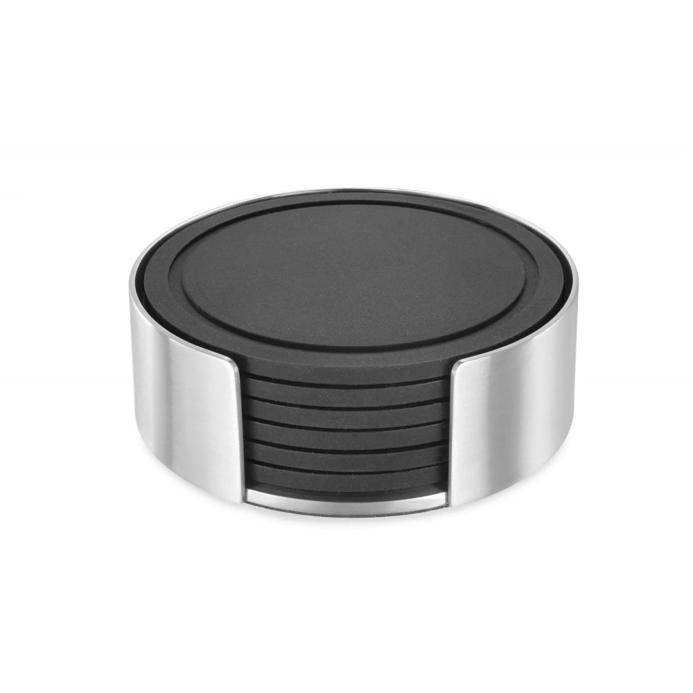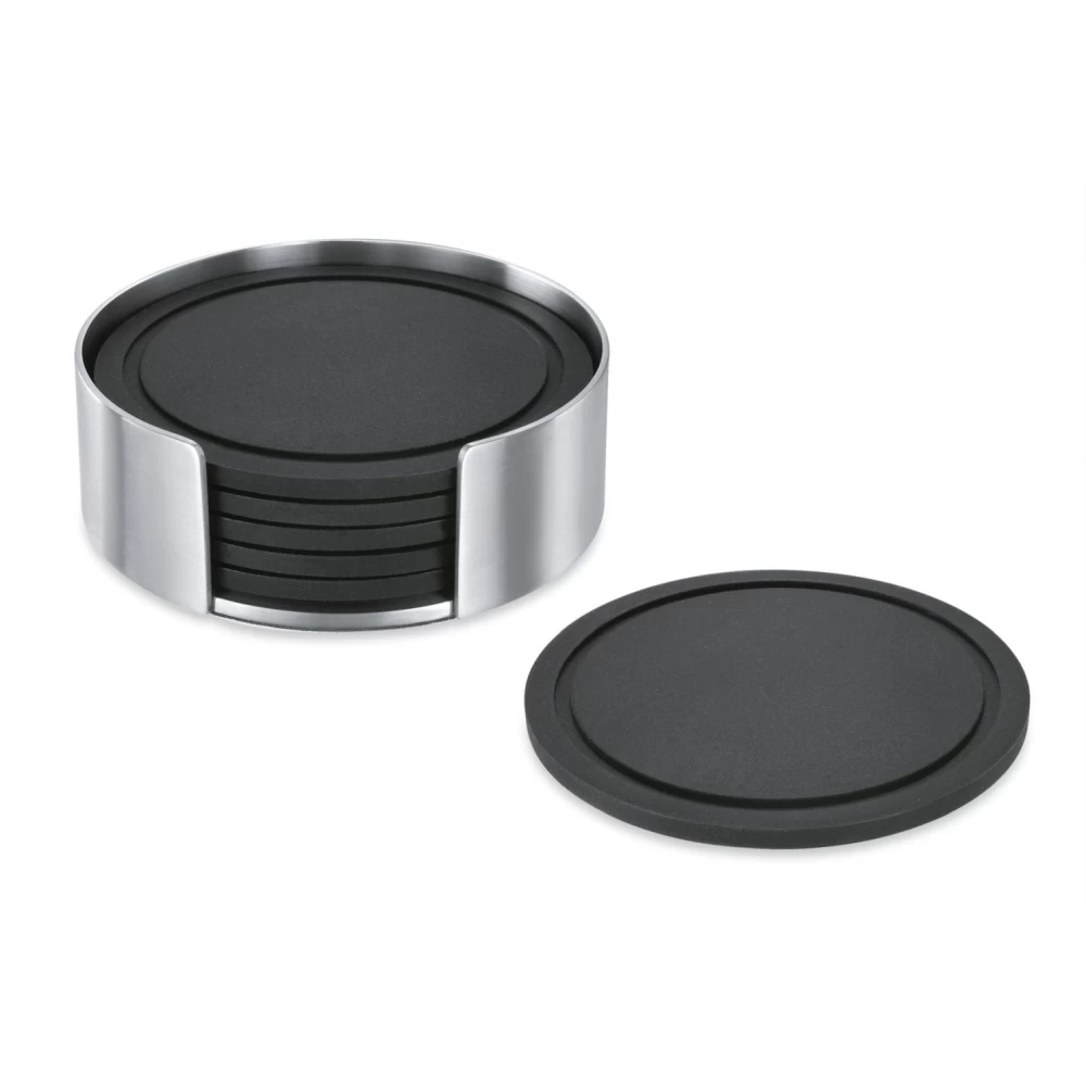 das hohe Eigengewicht des Halters sorgt für einen sicheren Stand; die Silikon-Untersetzer sind rutschfest, wasserabweisend, für warme und kalte Getränke geeignet, eine umlaufende Rinne verhindert ein Überlaufen von Flüssigkeiten